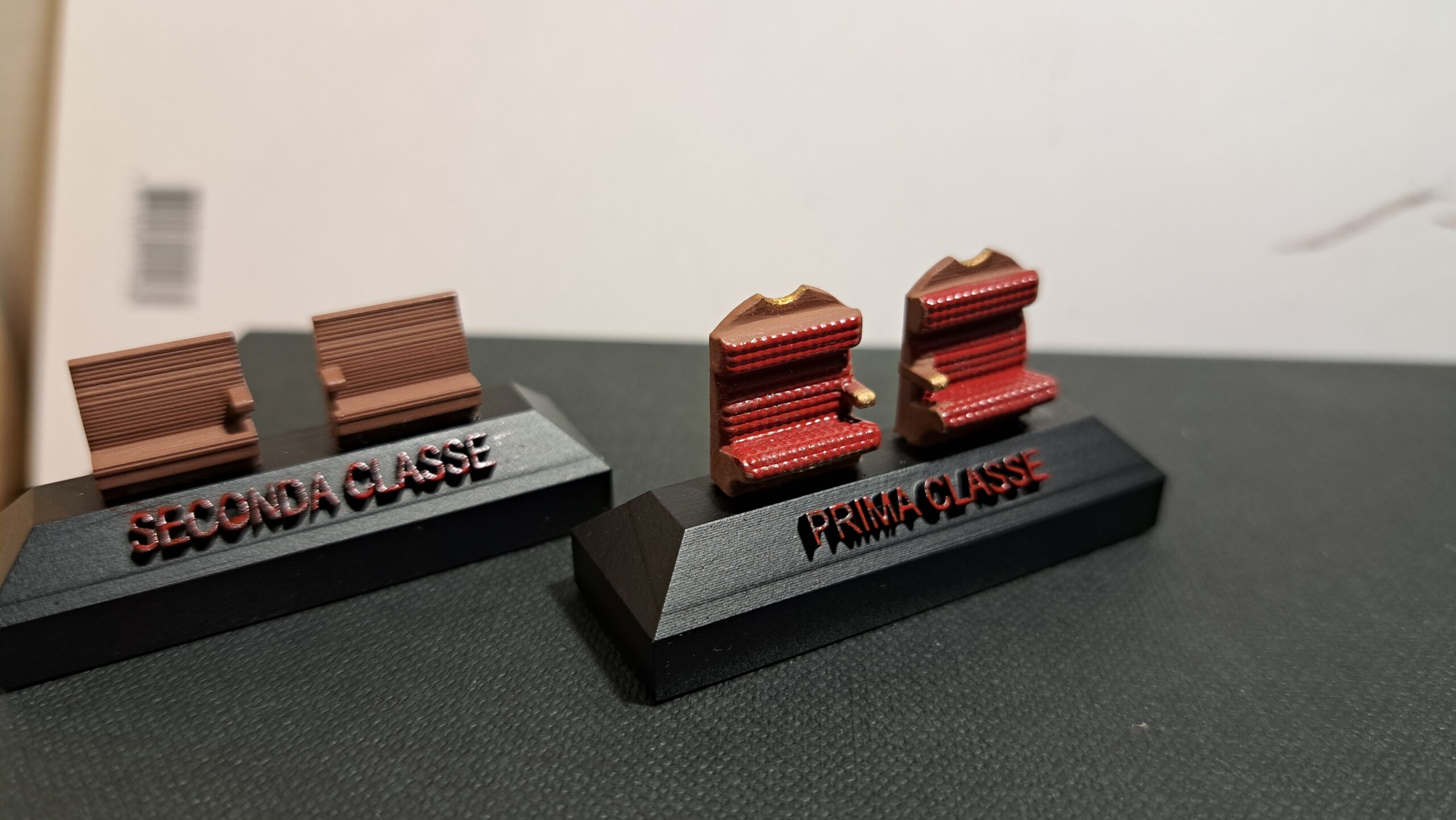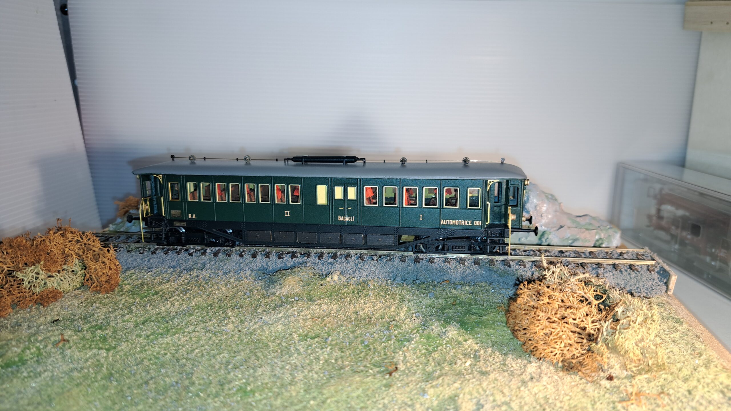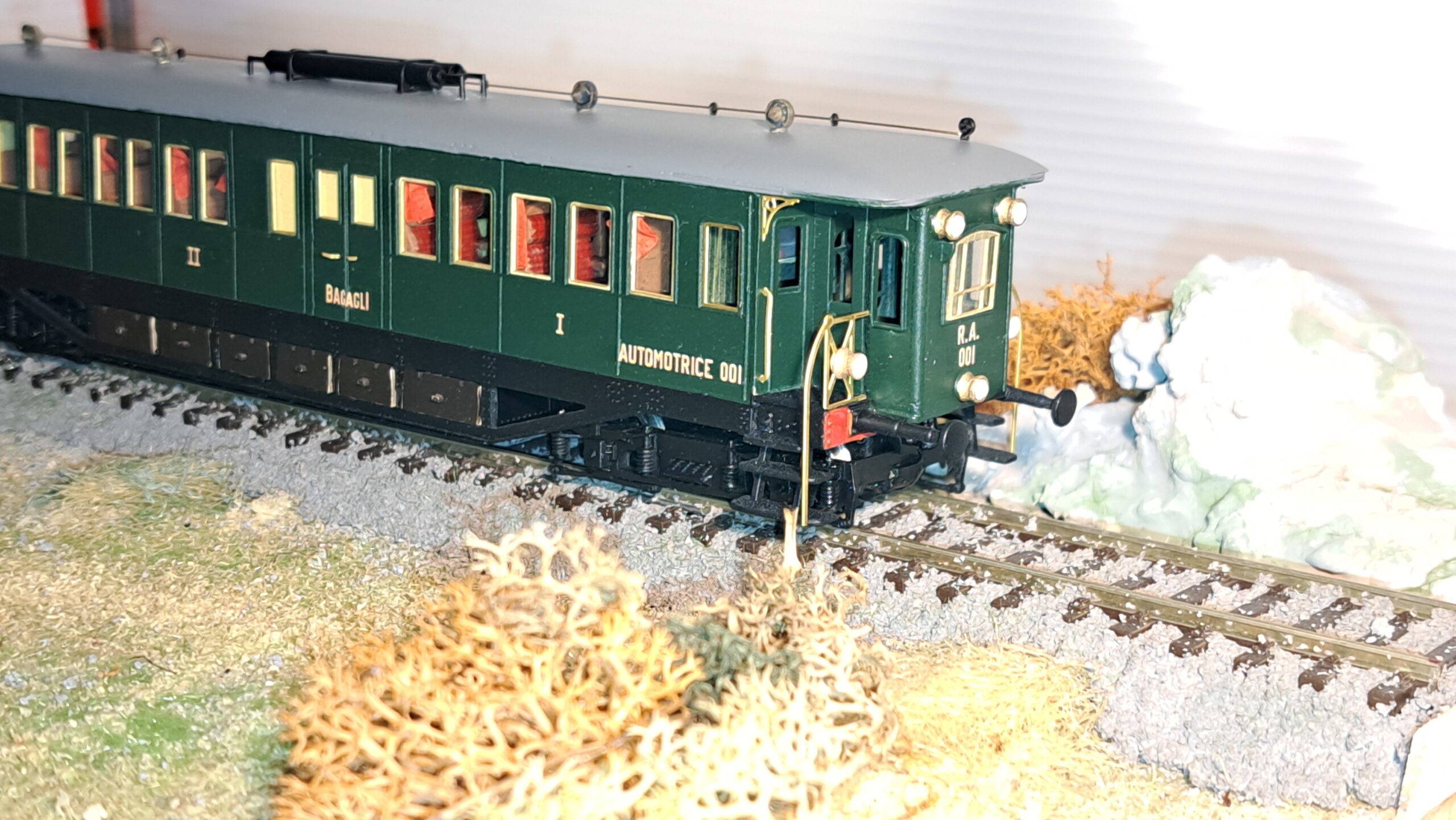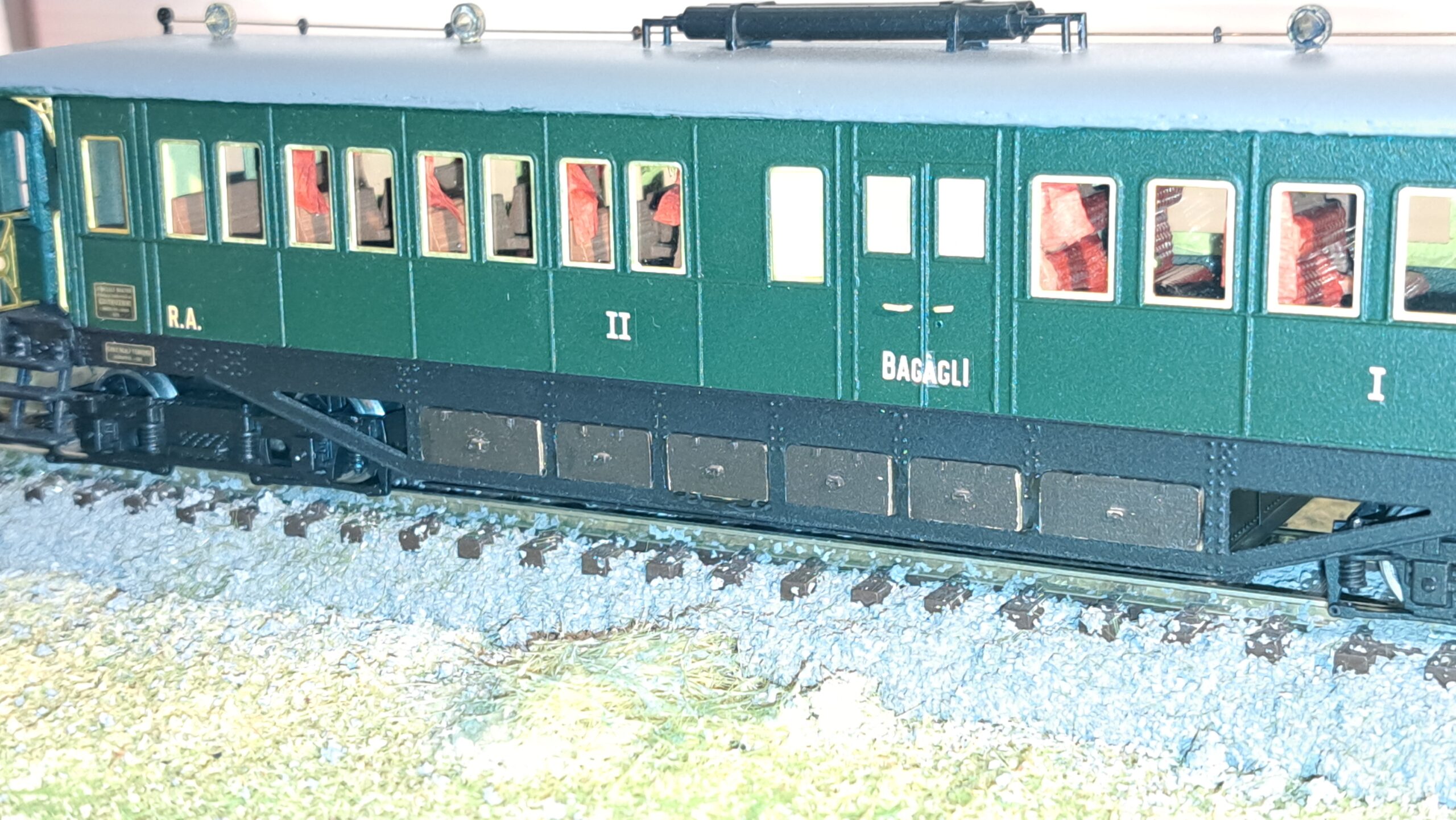 Come da foto, è stato riprodotto anche l’arredamento interno: divanetti in velluto rosso per la prima classe e sedili in legno per la seconda classe. Le tendine erano in raso rosso damascato; non ce ne vogliate, ma non siamo riusciti a riprodurre i disegni dorati in scala H0, accontentatevi del rosso. Il modello al momento (quello in foto è il primo prototipo) non ha l’impianto di illuminazione; ci stiamo lavorando, sia per i fari che per le luci interne, e ci auguriamo di riuscire nell’intento. A dicembre saranno disponibili i primi cinque esemplari, se interessati scriveteci alla mail: fatotreni@gmail.com