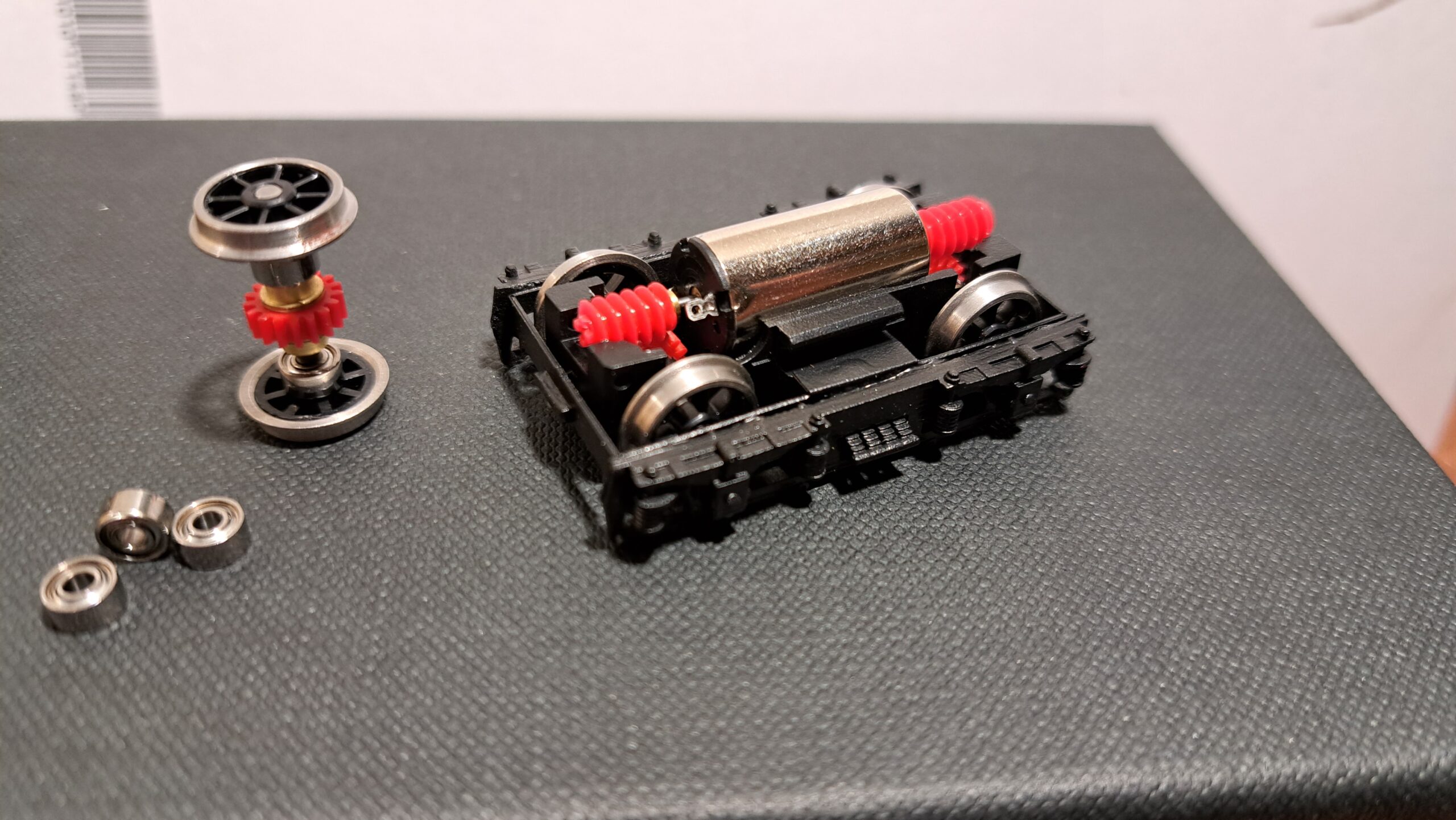 Il modello ha i due carrelli (vedi foto) entrambi motorizzati con motori a 5 poli a doppio ingranaggio e vite senza fine che insiste su tutti gli assi.  La trazione quindi è garantita su tutti gli assi. Gli assi sono caletti su micro cuscinetti a sfera che garantiscono la massima scorrevolezza.